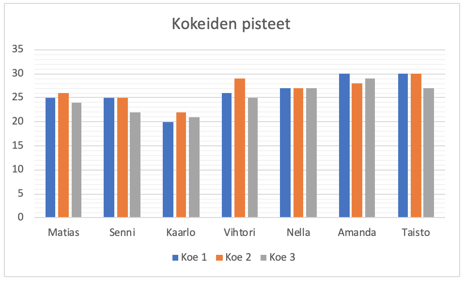 Huomioi, että jos muutat kaavion luomisen jälkeen taulukossa olevia tietoja, muutokset päivittyvät automaattisesti myös kaavioon. Kaavio sijoitetaan luomisen jälkeen oletuksena Excel-ohjelman taulukkopohjaan erillisenä objektina.